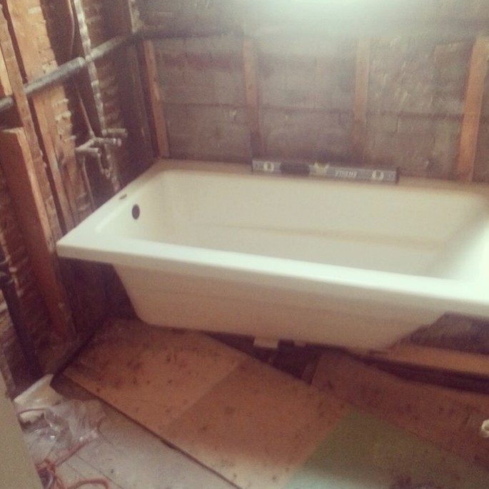 I've yet to see the progress of the reno in person, but get photos sent to me via e-mail. The boys got the new tub in place (top photo) and bumped out the bathroom wall to create a nook for the new vanity - giving us more floor space in our very tiny washroom. Tomorrow the drywall guys come and things start being put back together. We're a long way away from completion but perhaps inching closer to when it won't be super dirty and Oscar and I can move home.
